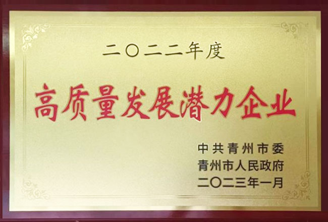 The company has been awarded the title of "2022 High Quality Development Potential Enterprise". This honor is a recognition from the city leaders of the company's technological innovation and independent research and development work; This award-winning event is also inseparable from the joint efforts of all innovative personnel in the company, let alone the strong support of the company's leadership for technological innovation work. It is the fruit of all employees working together to promote innovation and seek development.